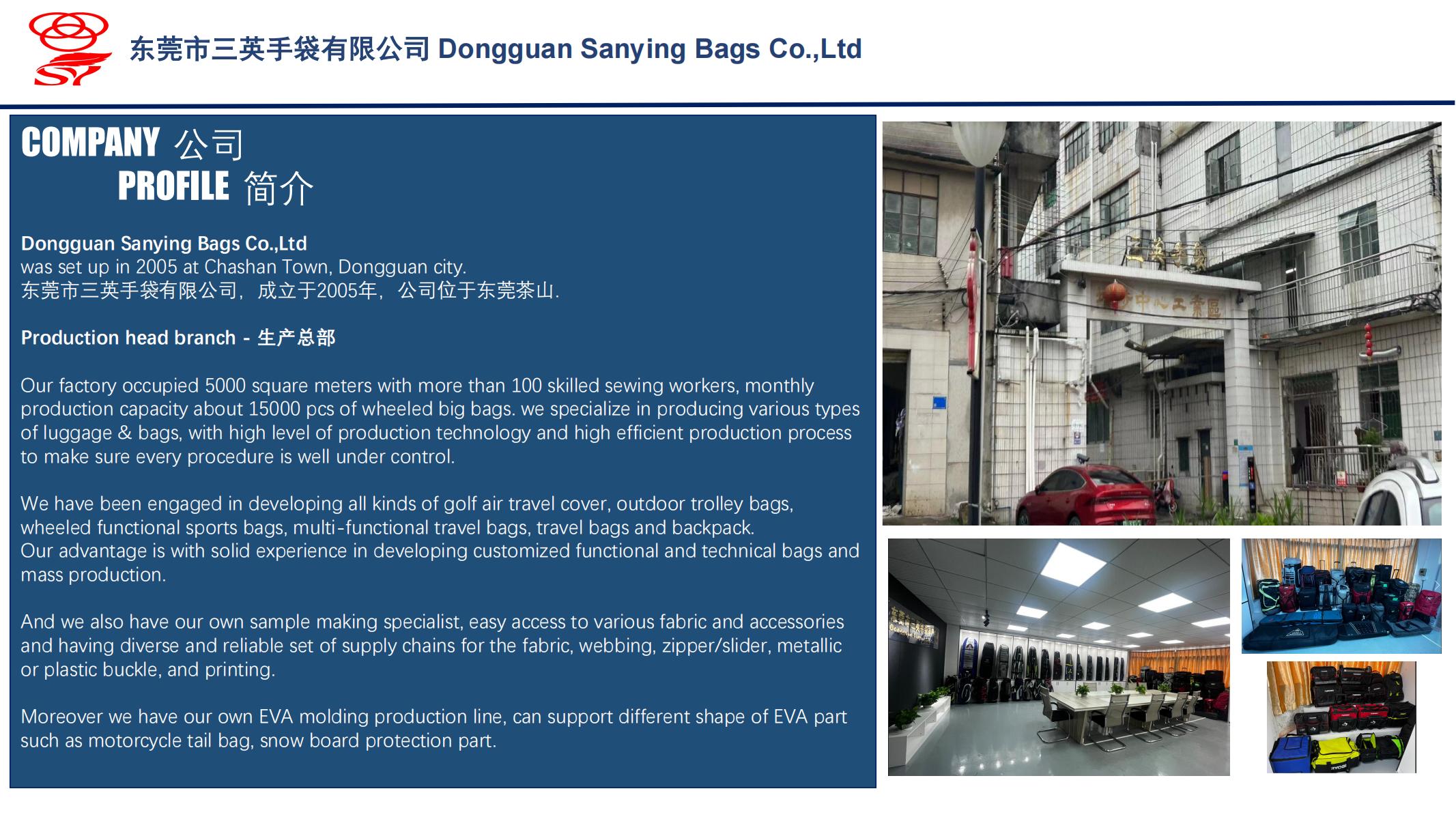东莞市三英手袋有限公司成立于2005年,位于中国广东省东莞市茶山镇,是一家专业定制、生产各类箱包、手袋、运动包、旅行包的实力工厂,也是知名的东莞高尔夫球包定制源头工厂。